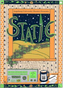 Static, a tragicomedy written by students Lucía Salazar-Davidson and Kyle Hayes, explores what we do in irredeemably harmful situations. Can we stay? Should we escape? What happens to the ones we leave behind? Through various misadventures, devastating miscommunications, a dash of music, and a sprinkle of sci-fi flair, this play aims to explore these questions.