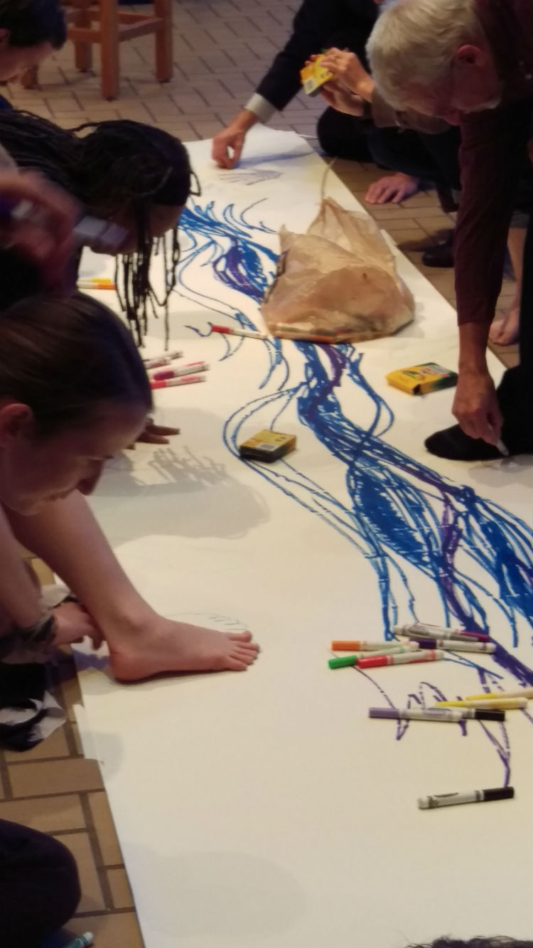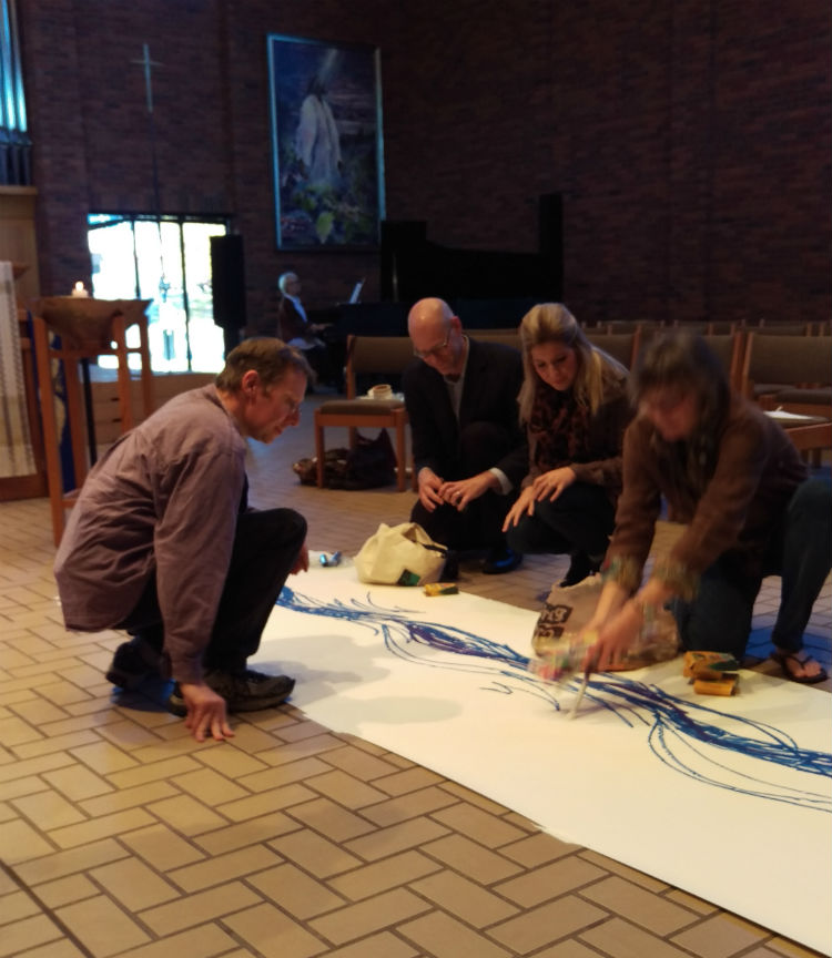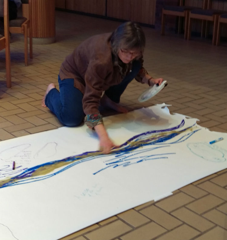 Augsburg College Campus Ministry welcomed Chillon Leach, Artist and Art Servant, to Daily Chapel on Tuesday, November 3. Chillon led a time of experiential expression of vocation and journey in Christ! We entered the chapel to find a long paper pathway stretching across the floor, extending out from the pulpit. During the opening hymn, Chillon kicked off her shoes and used markers and paints to begin sketching a river-like pathway down the middle of her canvas. Everyone who was gathered was then invited to join the journey by tracing around a foot or hand, or by adding meaningful words of their own spiritual journey to the work of art. Chillon finished by hand-applying gold paint to the pathway – highlighting the journey of the many footsteps and hand prints. Thank you to all who participated!