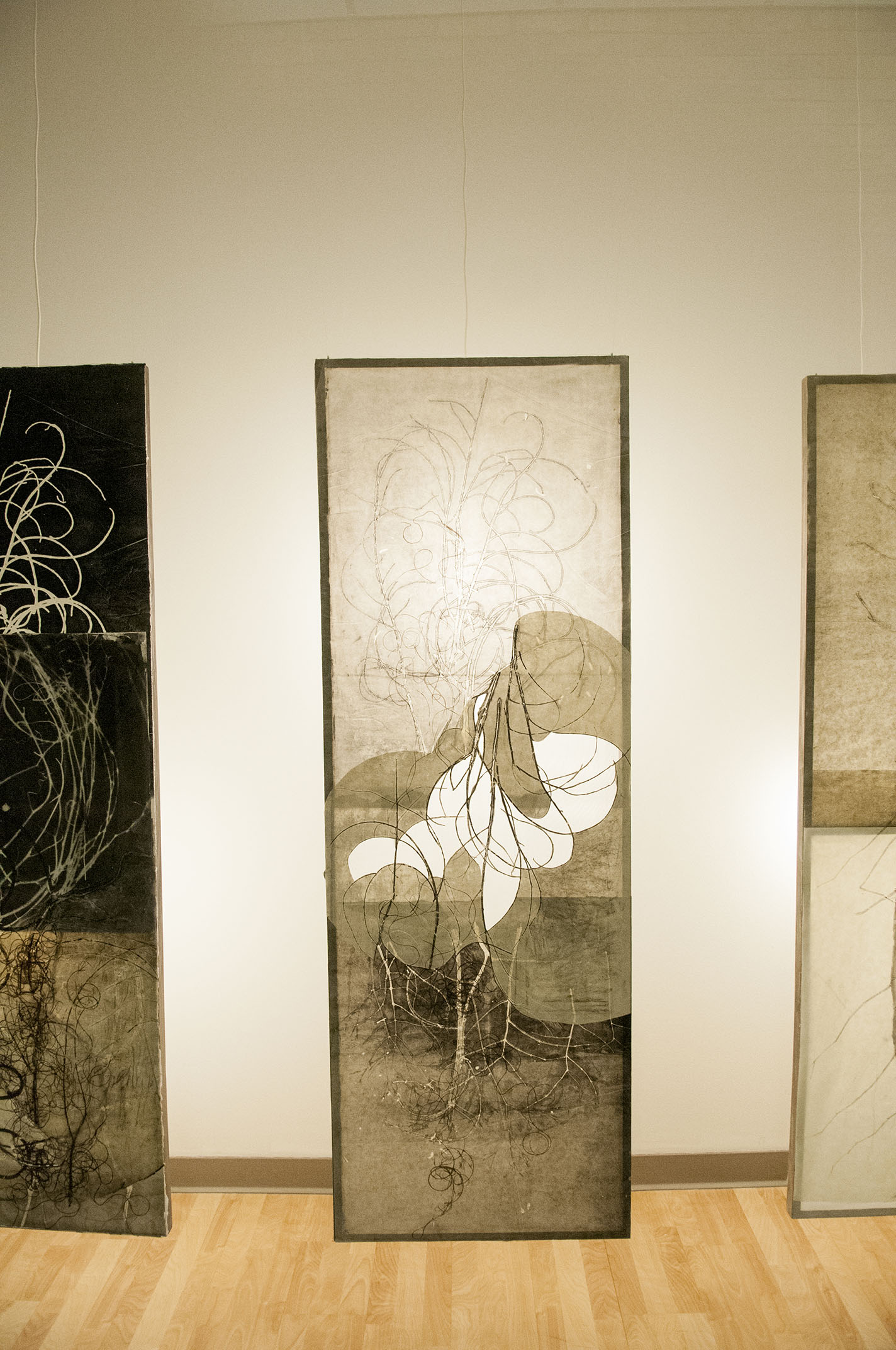 Natural forms speak to us in metaphors – a moth emerging from its cocoon, seeds blown on the wind… Nature holds a place in our most basic understanding of the world and forms the foundation for the language of our thoughts. The subjective, inner world of the mind mimics the objective, outside world – nature, bodies, spaces. I use printmaking and photography to make a record of actual objects, yet I find the resulting prints expressive, gestural and mysterious. Collaged together, they question pictorial space and natural symbolisms –linear branches physically carve and emboss the flat paper, then fall into deep illusionistic shadows, forming a subjective place within a skeleton of reality.