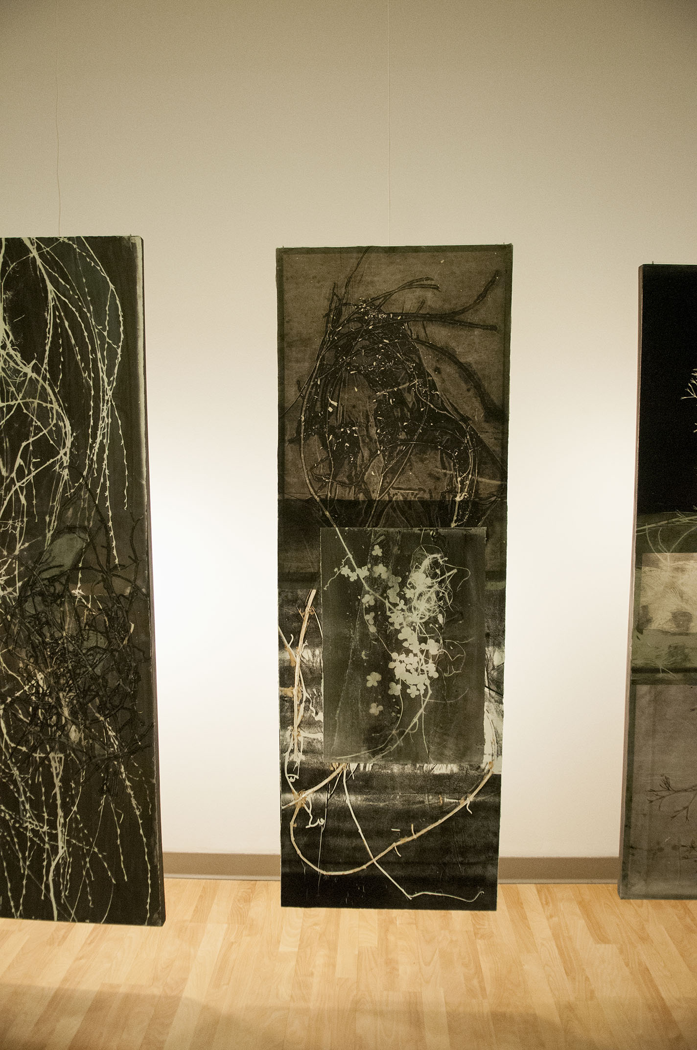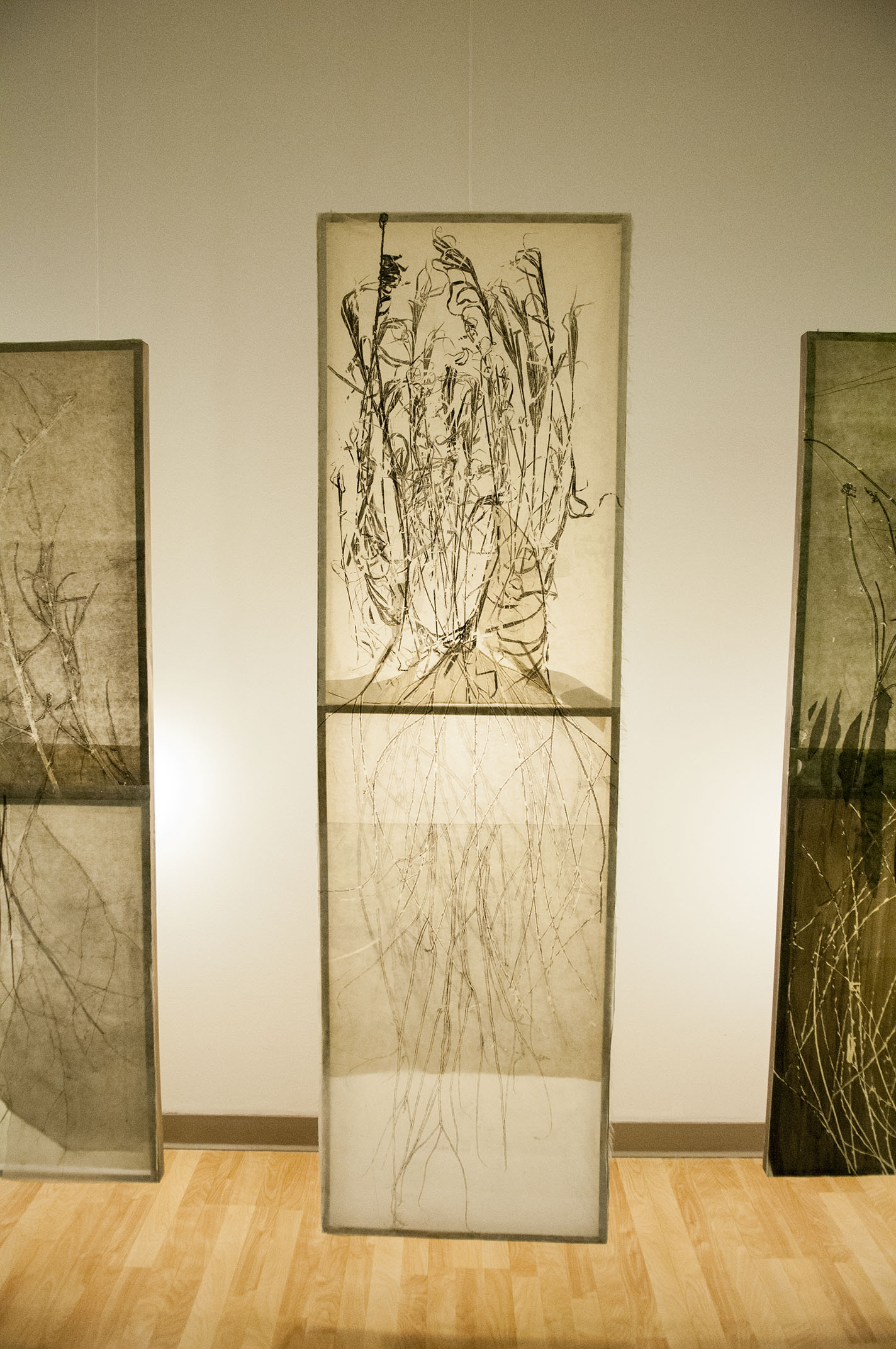 Hunder creates images that are records of actual objects – branches and grasses inked and pressed into paper with an intaglio press or recorded as photograms on sensitized paper. Although mimicking scientific recording in some ways, the resulting prints are gestural and expressive, forming a subjective place within a skeleton of reality.