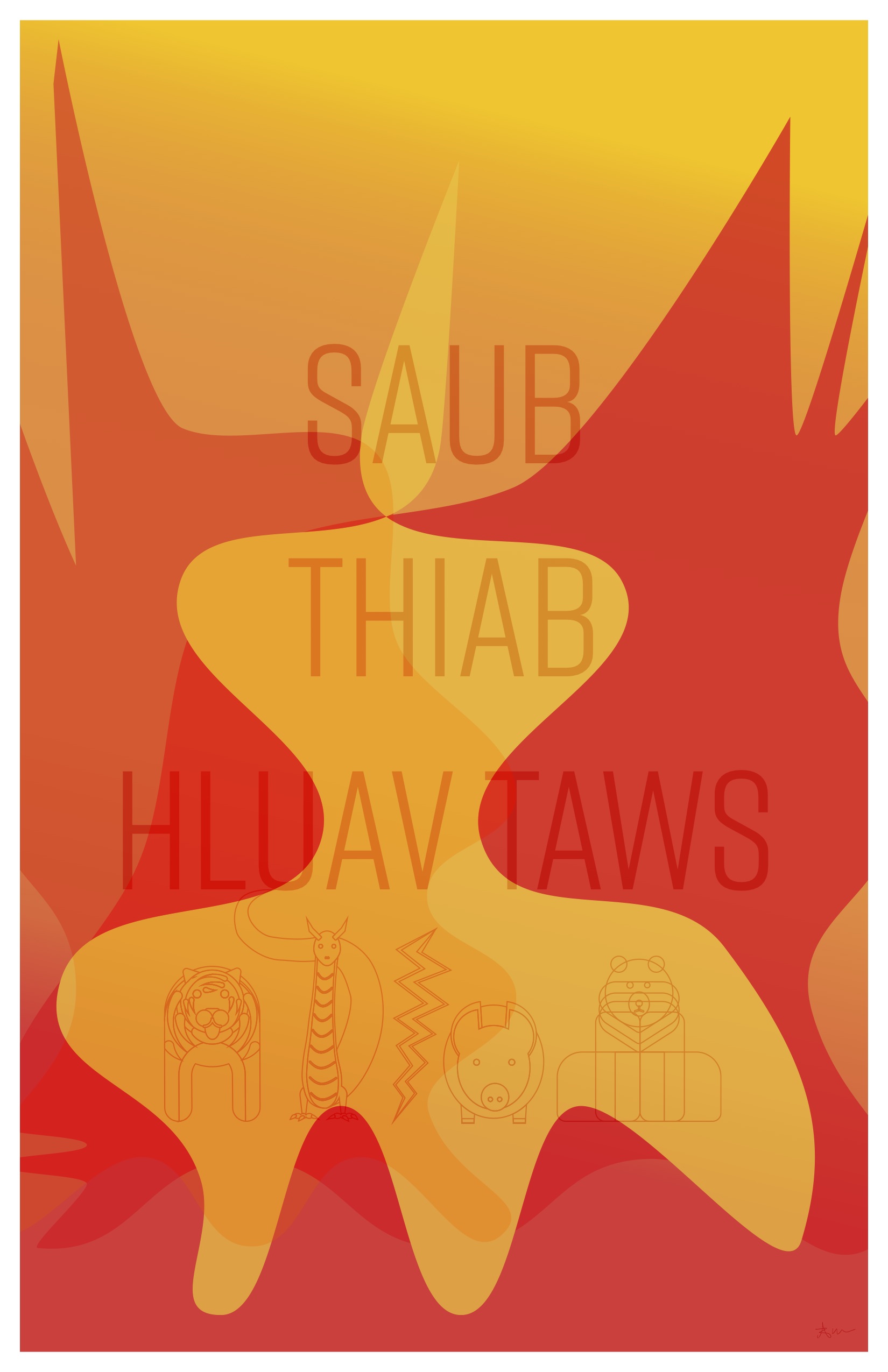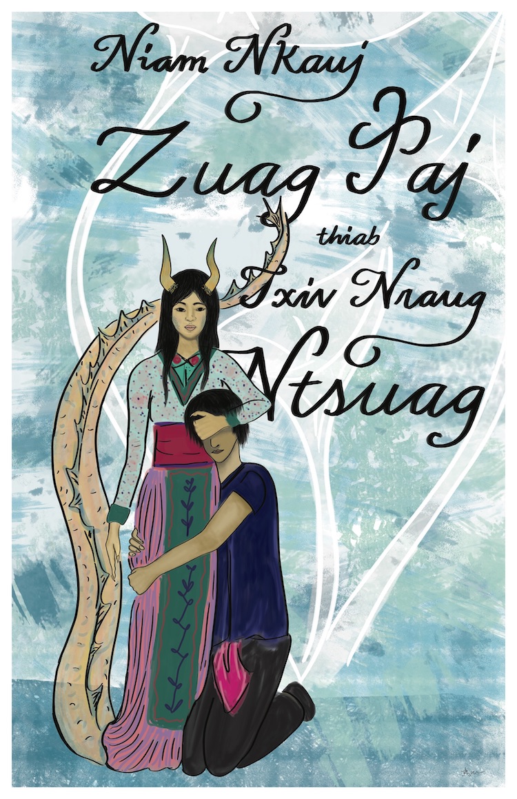Throughout this exhibit. I work digitally through the Adobe creative suite with their applications such as Photoshop and Illustrator. The dab neeg found in this exhibit takes inspiration from the book, Folk Stories of the Hmong by Norma J. Livo and Dia Cha, as well as popular Hmong movies from the early 2000s.