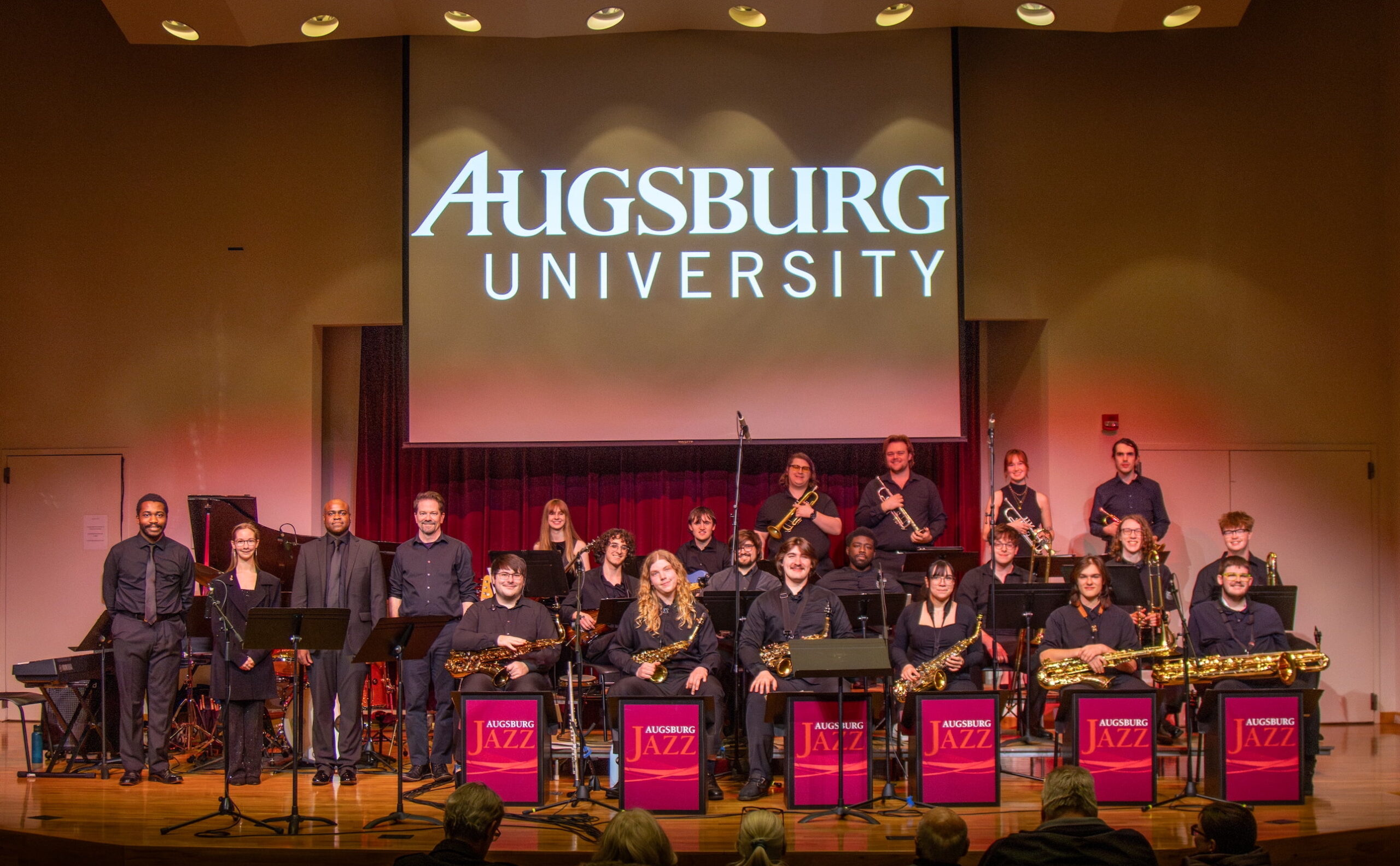 The Augsburg Jazz ensemble also provides an opportunity to create a unique union of big band and vocal jazz that performs for conventions, churches and schools (formerly known as Gospel Praise). They have appeared at three ELCA National Youth Conventions in Atlanta, New Orleans and St. Louis as well as The Dakota Jazz Club in Minneapolis, Famous Dave’s Blues Club in Uptown, and the Nobel Peace Prize Forum. In 1995, they presented a command performance for the King of Norway, and in recent years have performed for nearly 20,000 including Sheila Raye Charles, Jane Fonda, and Hillary Clinton.