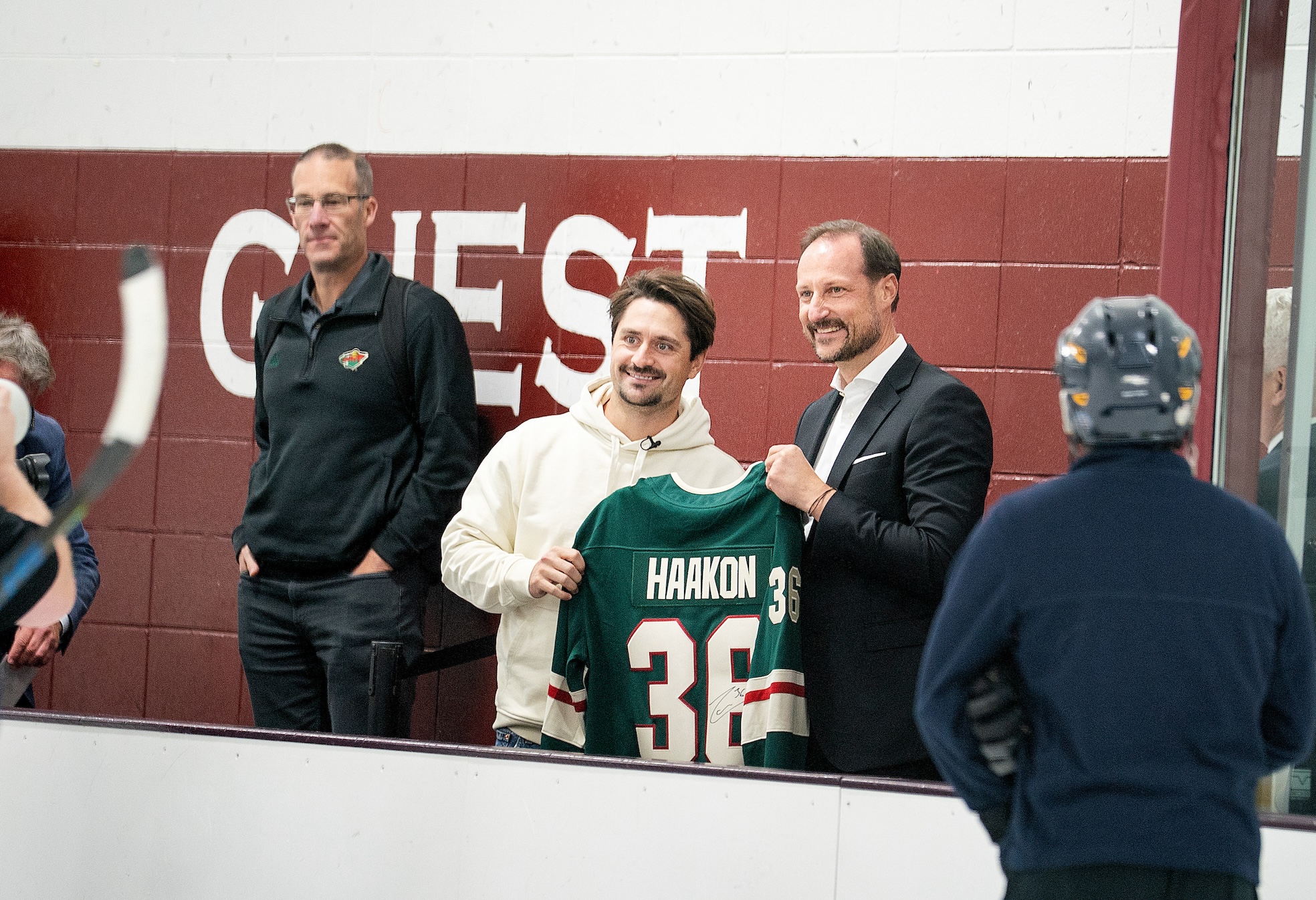 On Tuesday evening, a group of students and staff gathered to welcome His Royal Highness Crown Prince Haakon of Norway to the Augsburg ice arena. Minnesota Wild right wing Mats Zuccarello was also on hand to visit with members of the DinoMights youth hockey program during their regular practice at Augsburg. Zuccarello, a native of Norway, presented the prince with a special Minnesota Wild jersey with “Haakon” on the back. Augsburg Athletic Hall of Fame hockey player John Evans ’82 helped coordinate the visit and Board Chair John O’Brien served as the host.