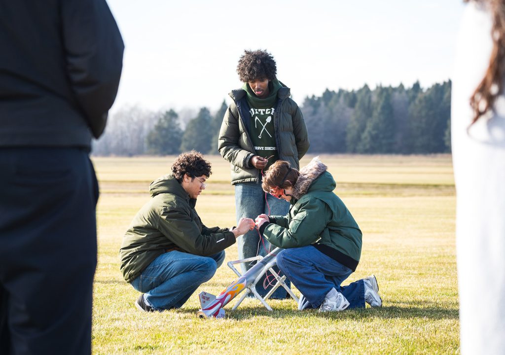 Top image: Mubarak Abdi ’27, center, works with other Augsburg students to construct a rocket as part of the Minnesota Space Grant Consortium’s Intercollegiate Rocketry Challenge. (Photo by Courtney Perry)