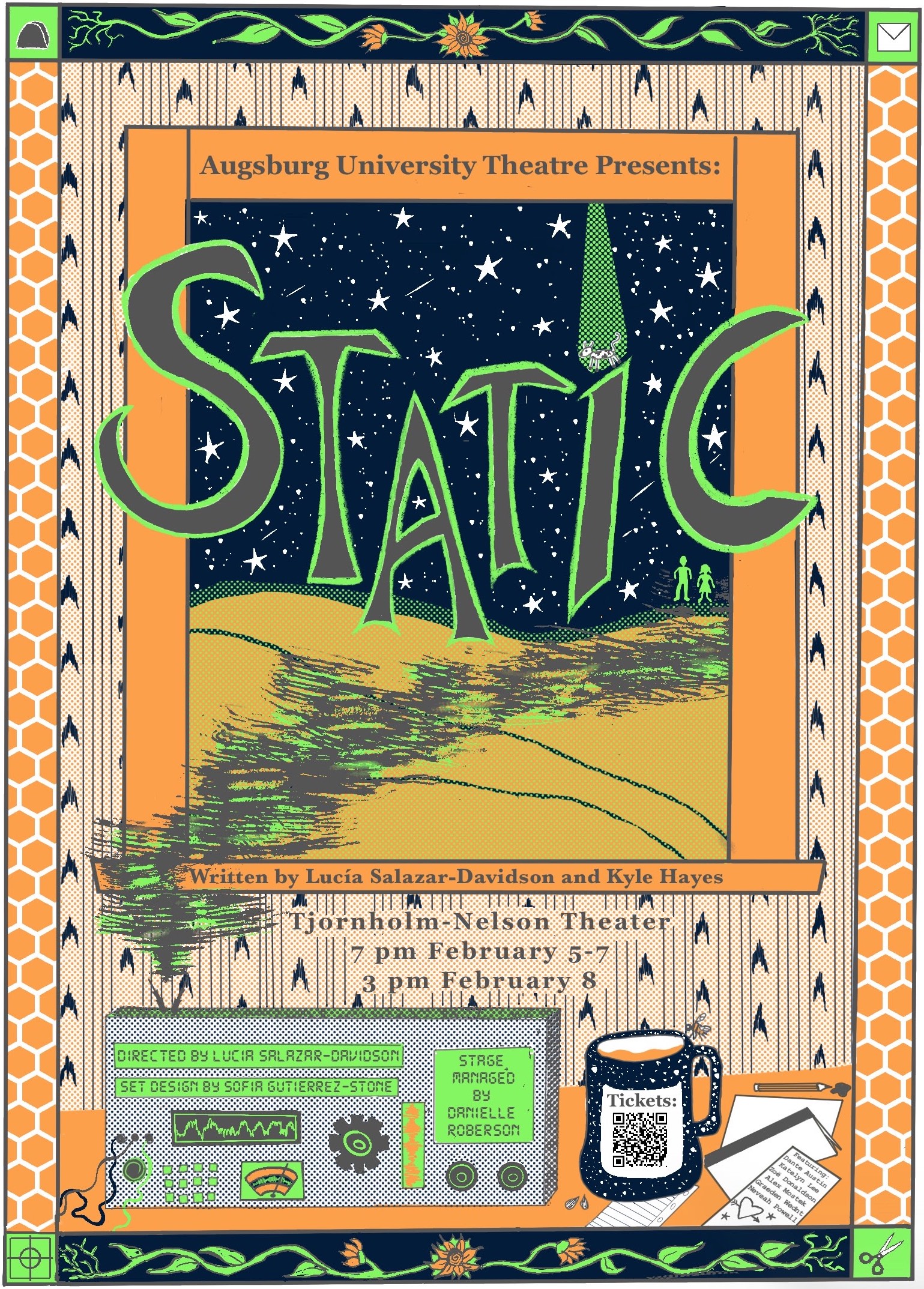 Static, a tragicomedy written by students Lucía Salazar-Davidson and Kyle Hayes, explores what we do in irredeemably harmful situations. Can we stay? Should we escape? What happens to the ones we leave behind? Through various misadventures, devastating miscommunications, a dash of music, and a sprinkle of sci-fi flair, this play aims to explore these questions.